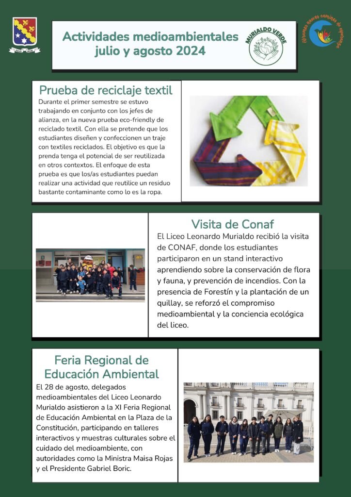 Revisa las actividades: Pruebas de reciclaje textil, Visita a CONAF y la Feria Regional de Educación Ambiental.